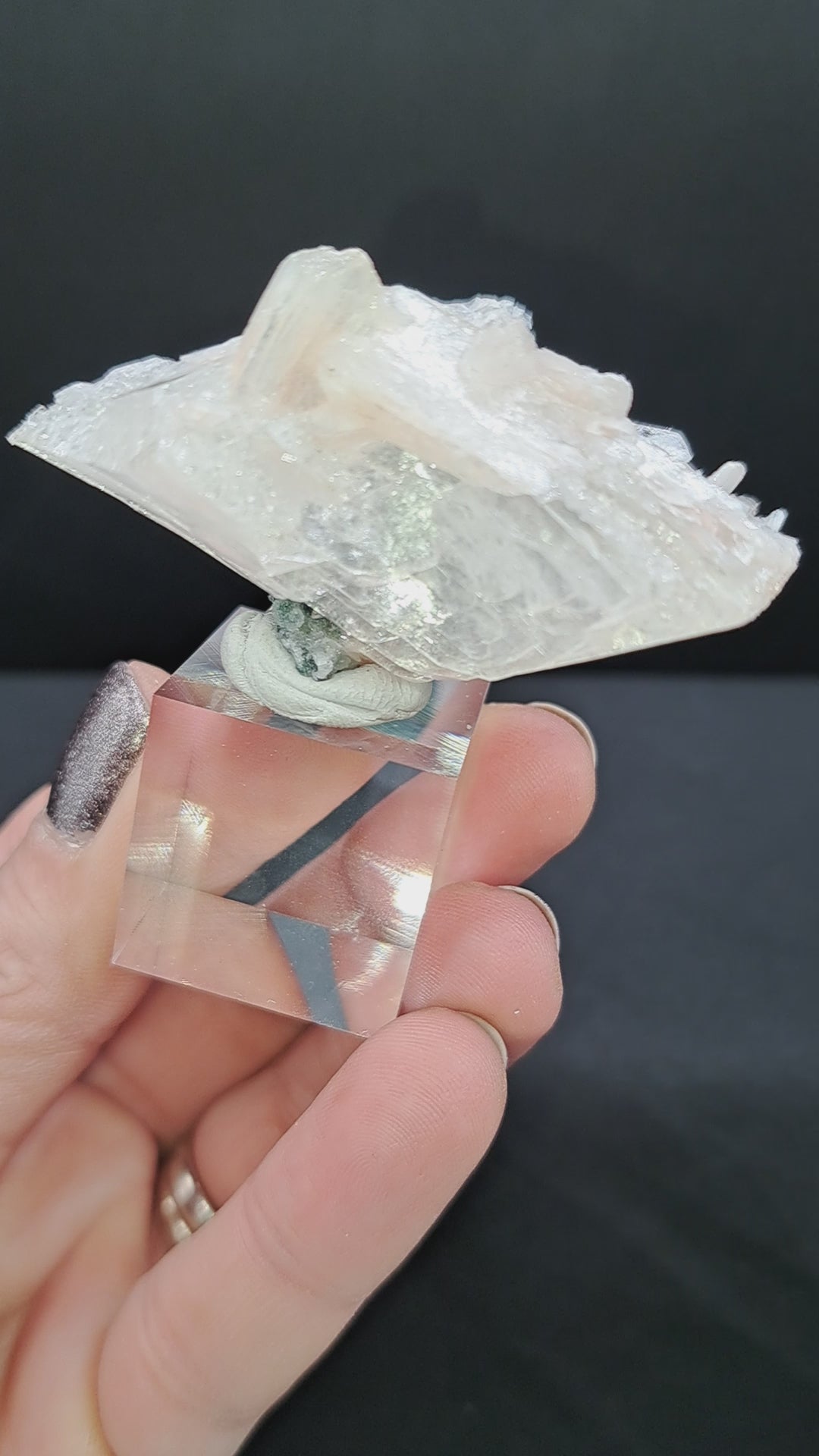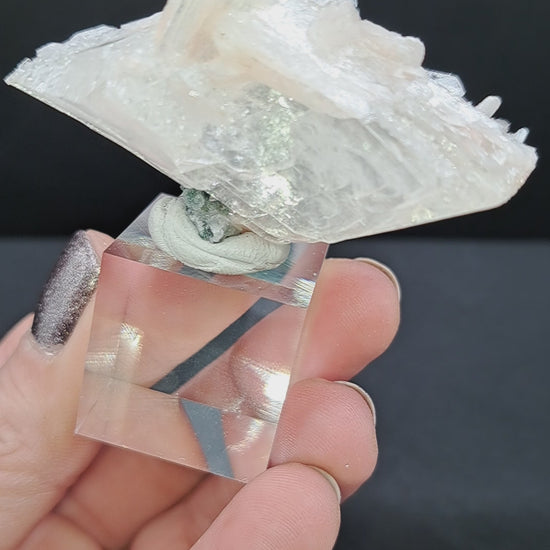 Incredibly glossy heulandite, formed in a classic bowtie spray around green chalcedony. Approx 2.25” wide, mounted on a 1" acrylic cube. Maharashtra, India.