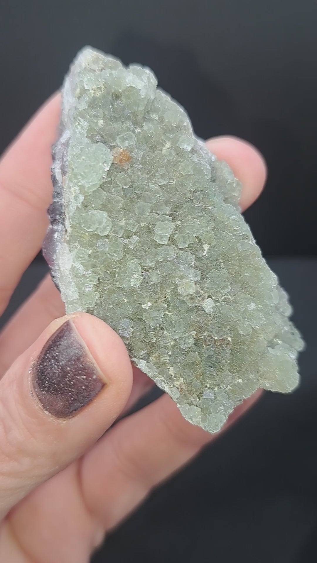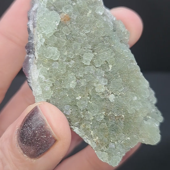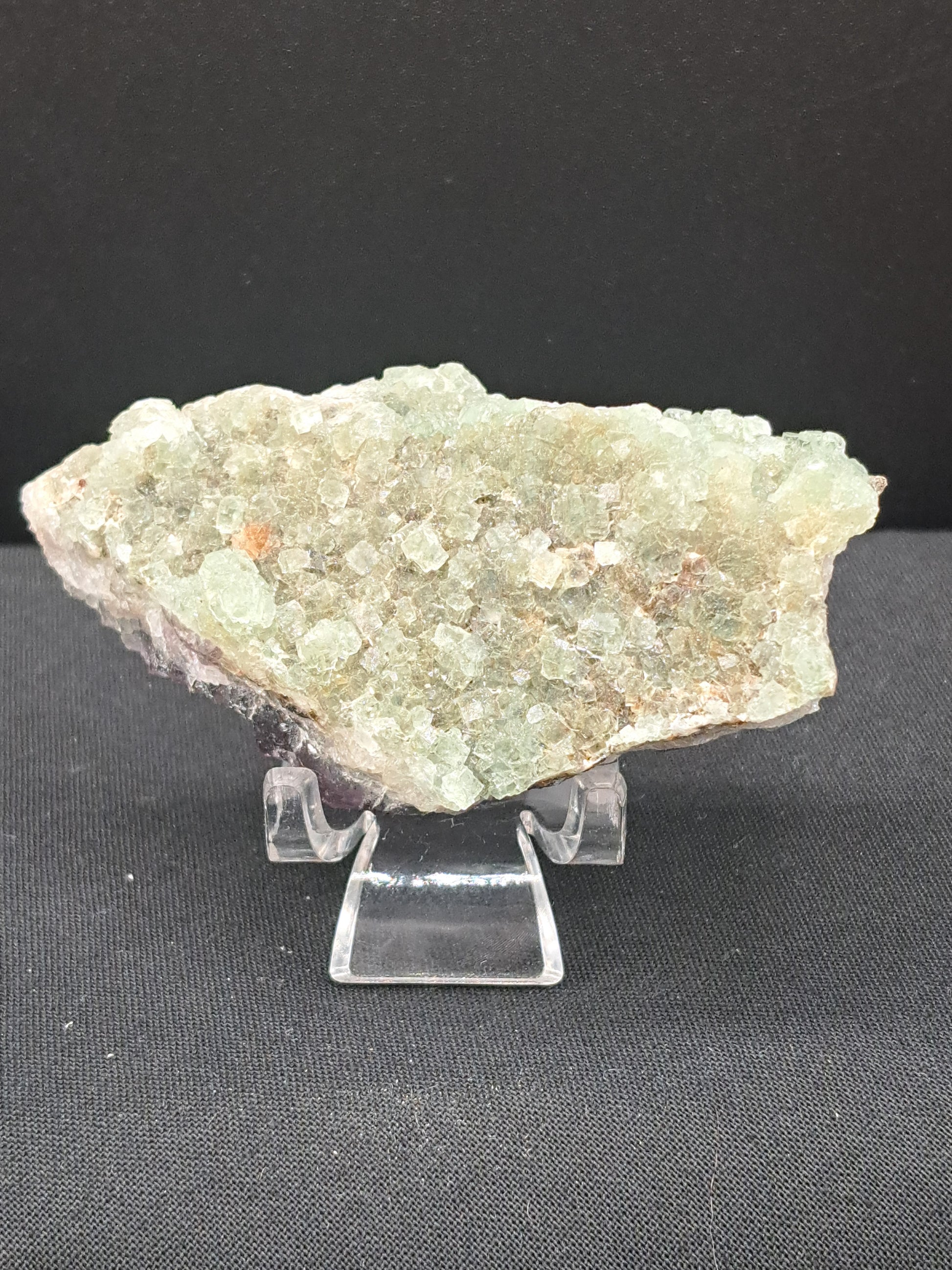 Small green fluorite drusy cubes sitting on green and purple fluorite core (no matrix). Comes with acrylic easel for display. Approx. 3” long. UV reaction shown with 365nm flashlight. Xianghualing Mine, Hunan, China