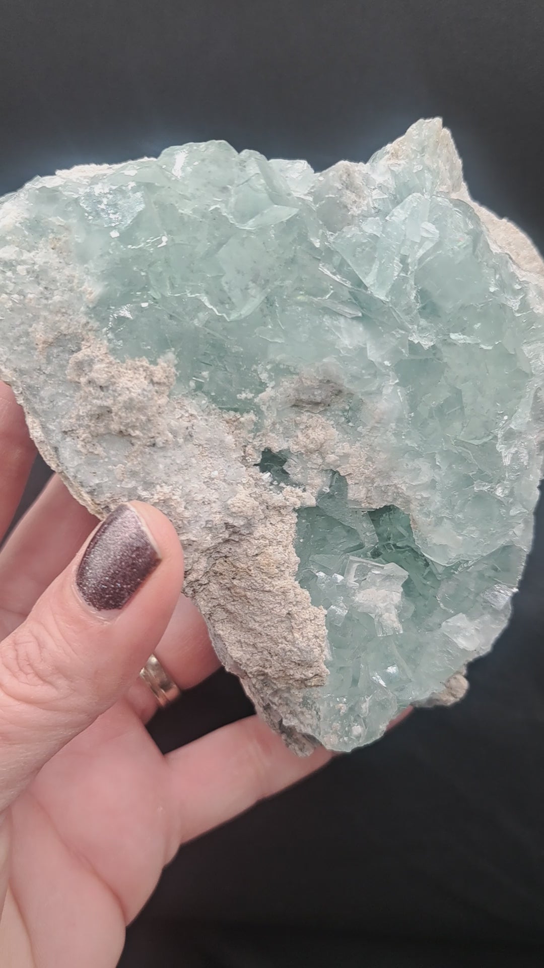 Stunning statement piece of super clear and gemmy mint green cubic fluorite with soft white zoning in some cubes. Matrix is composed of more fluorite. Self-standing, or looks great on large 3 prong stand (sold separately). UV photos shown with 365nm flashlight. Weighs 1 lb. 14 oz! Approx 5” wide and 4” tall. From Xianghualing, Hunan, China.